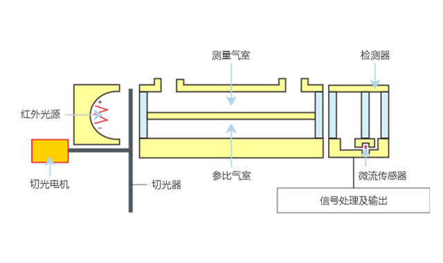 微流紅外(NDIR)技術(shù)基于氣體吸收理論,不同氣體分子會選擇性吸收光線特定波長的能量,通過微流檢測器檢測吸收強(qiáng)度的變化,并利用氣體濃度與吸收強(qiáng)度關(guān)系(朗伯-比爾Lambert-Beer)定律鑒別氣體組分并確定其濃度。同時采用了隔半氣室技術(shù),利用對紅外光線不吸收的氣體作為參比,可以消除光源衰減,溫度等外部環(huán)境變化的影響。