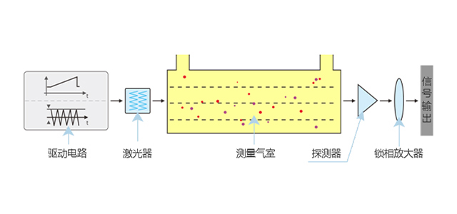 可調(diào)諧半導體激光吸收光譜法(TDLAS),是利用半導體激光器的波長調(diào)諧特性和待測氣體對激光的選擇性吸收進行氣體濃度檢測的一種技術。具有高靈敏度、實時、動態(tài)、多組分同時測量的優(yōu)點。其原理是可調(diào)諧半導體激光器在驅(qū)動電流的調(diào)制下,發(fā)射出特定波長的激光,隨著注入周期性電流的調(diào)制,激光波長產(chǎn)生周期性變化,使激光中心波長調(diào)節(jié)到待測氣體的吸收譜線,發(fā)生選擇性吸收,再利用經(jīng)過氣體吸收得到的光譜強度信號反演出待測氣體的濃度。因為半導體激光器的高單色性,可以利用待測氣體分子的一條孤立的吸收譜線進行測量,避免了不同分子光譜的交叉干擾,從而準確的鑒別出待測氣體。