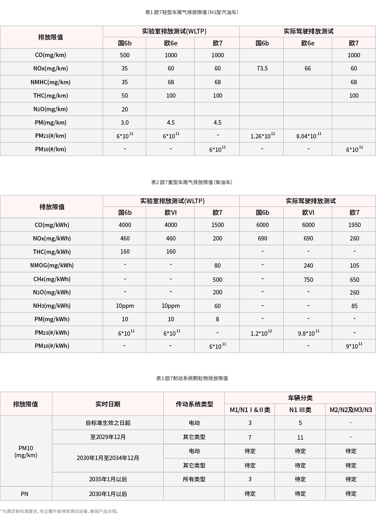 排放標(biāo)準(zhǔn)升級(jí)是機(jī)動(dòng)車污染減排的主要驅(qū)動(dòng)力。2024年歐盟發(fā)布的歐7標(biāo)準(zhǔn)不僅加嚴(yán)了尾氣污染物限值(表1-2),還新增了制動(dòng)系統(tǒng)和輪胎顆粒物排放檢測(cè)要求(表3)。我國生態(tài)環(huán)境部自2020年啟動(dòng)國七標(biāo)準(zhǔn)預(yù)研,目前第三期預(yù)研已進(jìn)入標(biāo)準(zhǔn)制定階段,國七標(biāo)準(zhǔn)即將出臺(tái)。